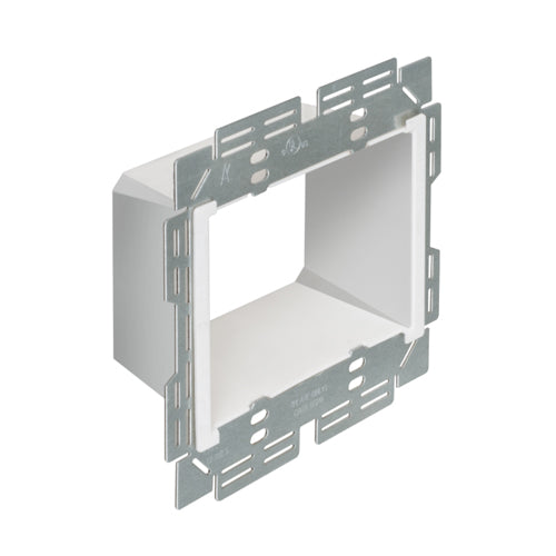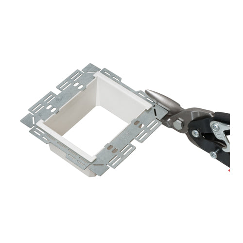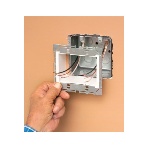 Heavy duty commercial grade Box Extender, levels and supports the wiring device where the box is set back from the wall surface extends the box up to 1-1/2". 2 hour fire rating. 2‐Gang. Trimmable to work with maxi, midi and standard wall plates.