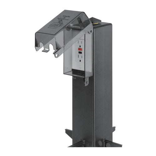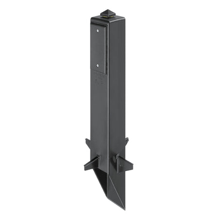 Gard-N-Post. 19.5" support for outdoor light fixtures or GFCI devices outdoors. Openings on both sides of post for back to back power or power on one side and low voltage on the other. Built in stabilizers for extra stability. Openings in stabilizers allow for insertion of extra support material. Angle Cut post for easy access to underground wiring. Two 1/2" Knockouts. Color Black. Color is permanent, no chipping. With Grounding Clip.
