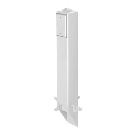 Gard-N-Post. 26" support for outdoor light fixtures or GFCI devices outdoors. Openings on both sides of post for back to back power or power on one side and low voltage on the other. Built in stabilizers for extra stability. Openings in stabilizers allow for insertion of extra support material. Angle Cut post for easy access to underground wiring. Two 1/2" Knockouts. Color White. Color is permanent, no chipping. With Grounding Clip.