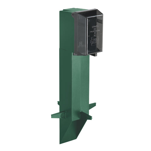 Gard-N-Post. 19.5" support for GFCI devices outdoors. Built in stabilizers for extra stability. Openings in stabilizers allow for insertion of extra support material. Angle Cut post for easy access to underground wiring. Two 1/2" Knockouts. Color Green. Color is permanent, no chipping. Clear extra duty weatherproof in use cover installed. With Grounding Clip.