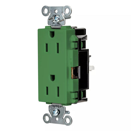 Hubbell HBL2152STGN, EdgeConnect Extra Heavy Duty Max Decorator Duplex Receptacles, Screwless Terminal, Back Wired, 15A 125V, 5-15R, 2-Pole 3-Wire Grounding, Green