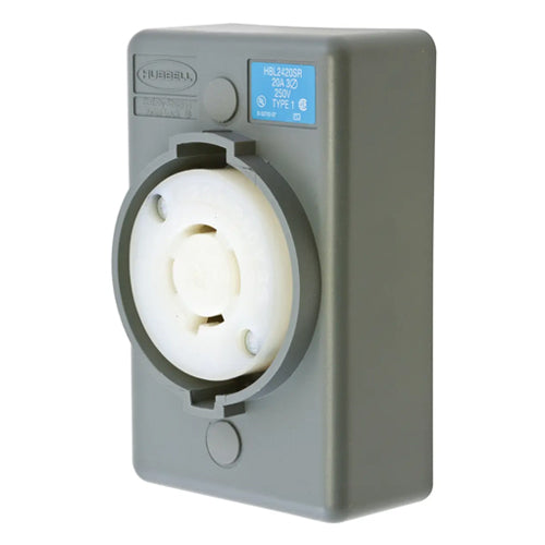 Hubbell HBL2420SR, Safety-Shroud Twist-Lock Receptacles, Surface Mounting, One Gang, Back Wired, 20A 250V, L15-20R, 3-Pole 4-Wire Grounding