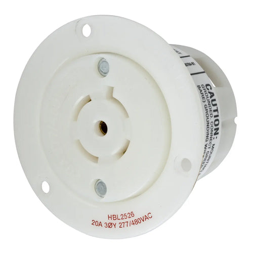 Hubbell HBL2526, Insulgrip Flanged Receptacles, Nylon Casing, Back Wired, 20A 277/480V, L22-20R, 3 Phase, 4-Pole 5-Wire Grounding