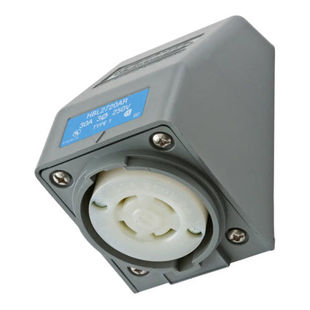 Hubbell HBL2720AR, Safety-Shroud Twist-Lock Receptacles, Gray Angle Housing, One Gang, Back Wired, 30A 250V, L15-30R, 3-Pole 4-Wire Grounding
