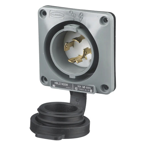 Hubbell HBL2745SW, Watertight Safety-Shroud Flanged Inlets, Gray Housing and Flange, 30A 600V, L17-30P, 3-Pole 4-Wire Grounding