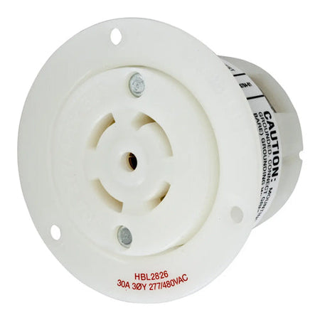 Hubbell HBL2826, Insulgrip Flanged Receptacles, Nylon Casing, Back Wired, 30A 277/480V, L22-30R, 3 Phase, 4-Pole 5-Wire Grounding