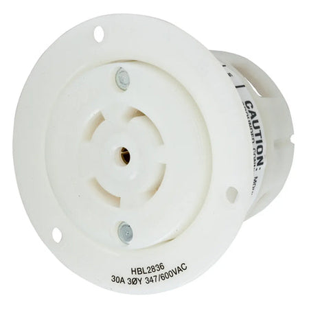 Hubbell HBL2836, Insulgrip Flanged Receptacles, Nylon Casing, Back Wired, 30A 347/600V, L23-30R, 3 Phase, 4-Pole 5-Wire Grounding