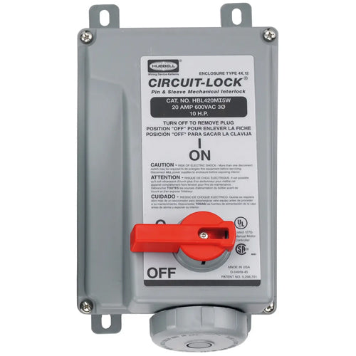 Hubbell HBL430MI5WR, Unfused Circuit-Lock Pin and Sleeve Devices, Watertight, Reverse Service Mechanical Interlock, 3-Phase, 30A 600VAC, 3-Pole 4-Wire Grounding