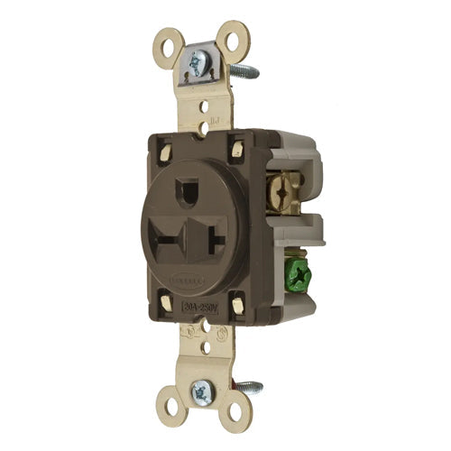 Hubbell HBL5461, Extra Heavy Duty Max Single Flush Receptacles, Nylon Face, Back and Side Wired, 20A 250V, 6-20R, 2-Pole 3-Wire Grounding, Brown