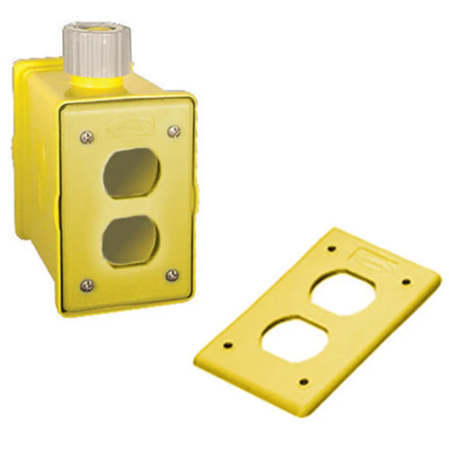 Hubbell HBLPOB1DY, Yellow Portable Outlet Box With Cord Strain Relief, with Two Duplex Plates