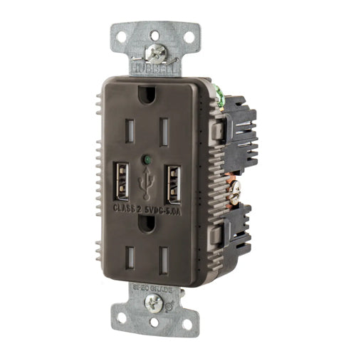 Hubbell USB15A5, USB Charger Tamper Resistant Duplex Receptacles, Commercial Grade, LED Indicator, Two Type A Ports, 15A 125V, 5-15R, 2 Pole, 3 Wire Grounding, Brown