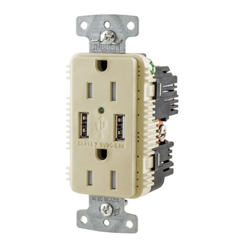 Hubbell USB15A5I, USB Charger Tamper Resistant Duplex Receptacles, Commercial Grade, LED Indicator, Two Type A Ports, 15A 125V, 5-15R, 2 Pole, 3 Wire Grounding, Ivory
