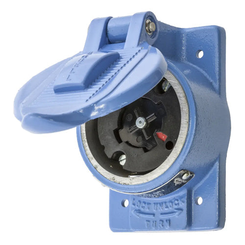 Hubbellock® HBL25250, Receptacle, Black Phenolic Interior, Aluminum Weatherproof Housing, Blue Finish, For FS/FD Box Mounting, 20A 250VDC/30A 600VAC, 4-Pole 5-Wire Grounding