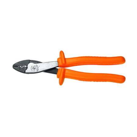 The Klein Tools Insulated Crimping/Cutting Tool crimps wire from 10 to 22 AWG. This crimper/cutter features a tapered nose for working in confined spaces. Additionally, it features bright orange outer coating on the handles that is flame retardant and impact resistant.
