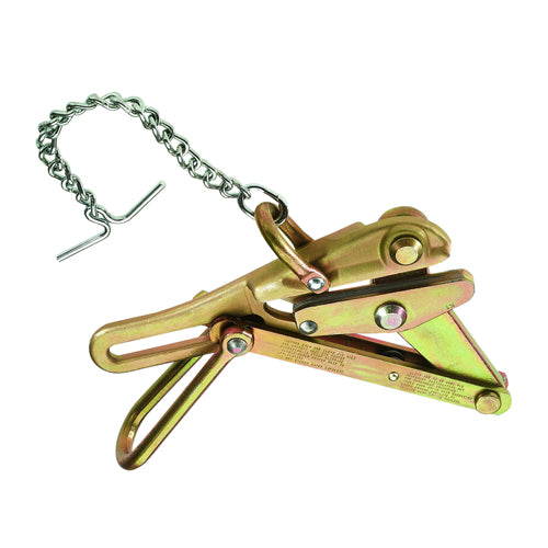 The Klein Tools 1628-16AT Chicago Grip is identical to a Bell-System type H Strand Puller. It is equipped with a chain, toggle and shackle to keep the grip from falling off the cable. All Klein grips are manufactured from custom drop-forged steel that is machined and heat treated for excellent durability. Each grip is individually hand inspected and actuated for proper function. Grips are also rigorously tested and pulled to rated load to ensure the highest quality and reliability.