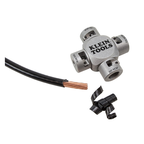 A quick and effective tool to cleanly remove the insulation on MTW/THHN/THWN-2 cable without nicking the wire. Clover design features four different sizes (350, 500, 600 and 750 MCM) in one tool. Simply insert the cable and twist for precise, clean cuts. The robust design ensures long tool life. Stripping cables has never been easier and safer. Replaceable blades and screws (Cat. No. 21051B) available for extended use.