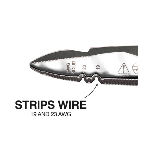 - Features two stripping notches on the upper blade to effortlessly strip 19 and 23 AWG wires