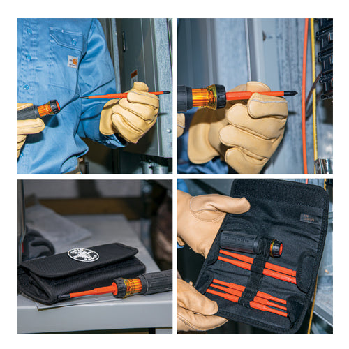 Klein Tools' Interchangeable Insulated Screwdriver Set includes an insulated handle and 5 interchangeable insulated blades for quick changes on the job. The auto-eject mechanism works with just a twist, allowing you to change or flip blades simply and easily. A bright orange coating of insulation protects from electrical shock, as well as being flame and impact resistant. Klein insulated tools exceed the ASTM F1505 standards for insulated tools, and are clearly marked with the official 1000-volt rating symbol. The set of five Phillips, Square and Slotted slim-tip blades come in a protective roll pouch, making this the perfect set for your tool bag.