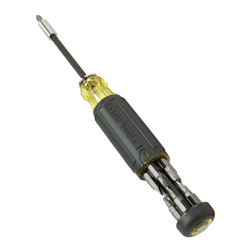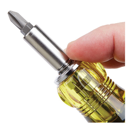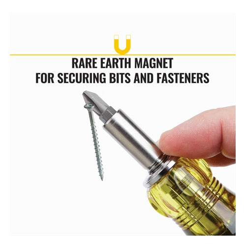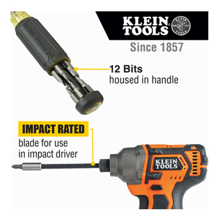 Klein Tools' Adjustable Length Screwdrivers function both as multi-bit screwdrivers and impact driver attachments. Industrial-strength bits are conveniently housed in the handle. Simply adjust the length of the blades to allow for easier access or remove to use with an impact driver. Powerful rare earth magnets secure bits and fasteners while the Cushion-Grip™ handle provides outstanding comfort and control.