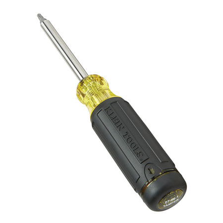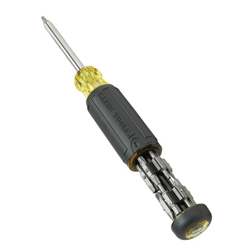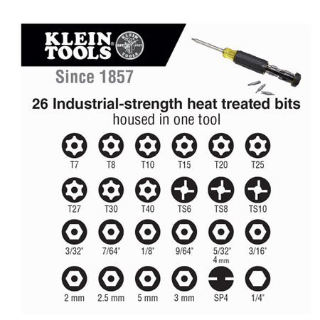 Klein Tools' Multi-bit Screwdrivers help make your job a little easier. The 27-in-1 Tamperproof Screwdriver offers 26 specialty bits conveniently stored right in the handle and an integrated 1/4-Inch nut driver. Powerful Rare-Earth magnets in the barrel secure the bits and fasteners. This screwdriver features industrial-strength bits as well as Cushion-Grip™ handles for outstanding comfort and control.