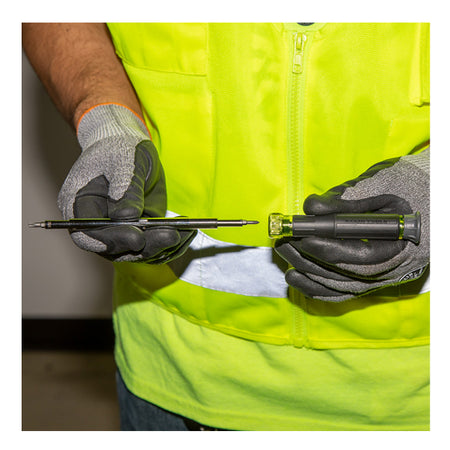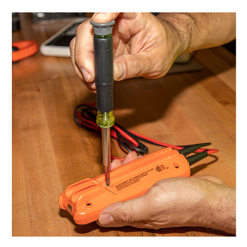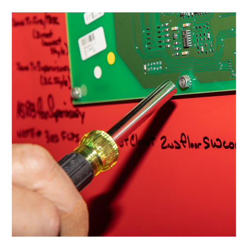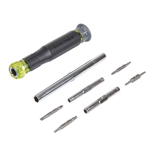 Klein Tools' 14-in-1 Precision Screwdriver / Nut Driver features 14 of the most common precision sizes in one tool. The Cushion-Grip™ handle and spin cap provide outstanding comfort and control. This smartly designed tool contains 6 sizes of integrated steel nut driver shafts that securely hold four double-ended screwdriver bits. Carefully heat-treated for industrial strength, the precision-milled bits include multiple sizes of slotted, Phillips and Tamperproof TORX® bits.