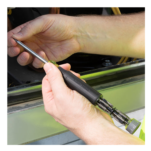 - Industrial-strength, double-sided bits are conveniently housed in the handle, eliminating the need for a bulky bit block or case