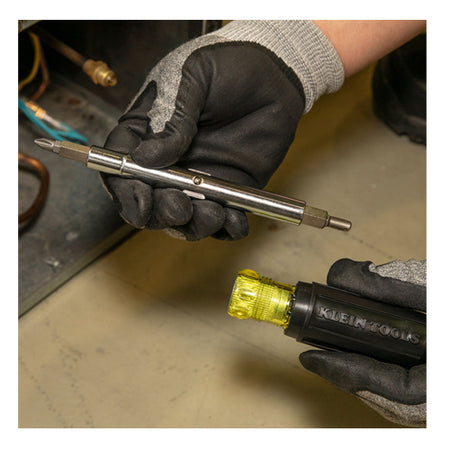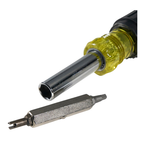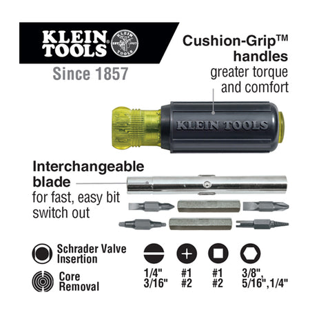 With Klein Tools 11-in-1 multi-bit screwdriver carry fewer tools in your bag. This screwdriver / nut driver comes with a Schrader bit, 2 Phillips bits, 2 Slotted bits, 2 Square bits, and 3 Nut Driver sizes. Each of the 11 tips is blast finished to provide a firm hold and reduce cam out. It also has Klein's Cushion-Grip™ handle for greater torque and comfort.