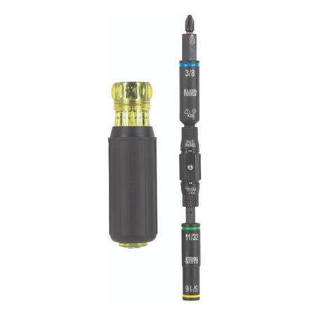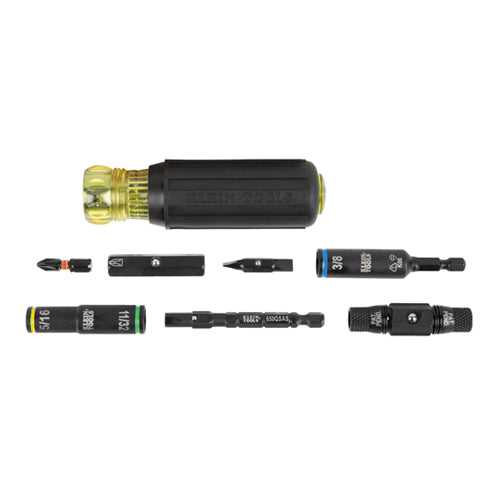 Klein's HVAC impact-rated multi-tool brings a new-to-world design to a classic 10-in-1 screwdriver / nut driver. Compatible with both an impact driver and the included screwdriver handle, eliminating the need for extra power tool accessories.The tool houses 3 popular tips, converts to 5 nut driver sizes and includes a 1/4-Inch bit holder and 12-Point, 1/2-Inch KNECT™ collet. It's the familiar feel of a multi-bit screwdriver / nut driver, with the added benefit of power tool compatibility.