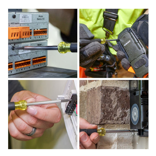 Klein Tools electronics screwdrivers are designed for precision work, and feature a swivel cap for optimum control. Made of the highest quality tempered steel, carefully heat-treated for maximum strength, and precision milled to fit screw openings securely. Rotating caps and Klein's exclusive Cushion-Grip™ handles offer outstanding comfort and control. Corrosion-resistant chrome plated barrel that includes two double-ended bits that exceed ANSI standards.