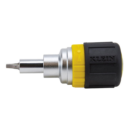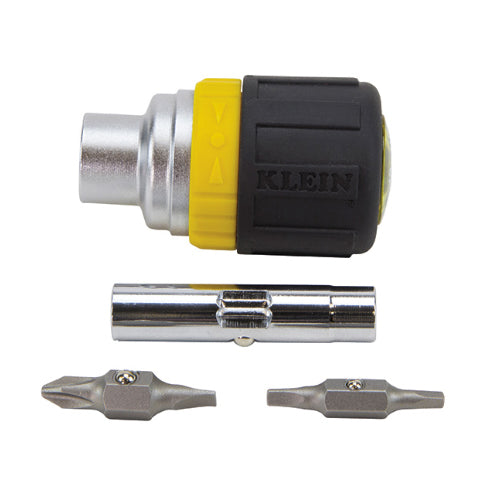 Klein Tools Multi-Bit Stubby Screwdriver / Nut driver with ratcheting mechanism lets you work faster and with more efficiency. Includes 1/4-Inch and 5/16-Inch nut drivers. With its Cushion-Grip™ handle, the stubby interchangeable screwdriver/nut driver was designed for comfort and efficiency. Made of the highest-quality tempered steel, the strong, durable tips are manufactured with square edges to securely fit screw opening. They resist slippage and provide positive turning action. The strong nut driver function improves bit-holding power, even for tough applications.