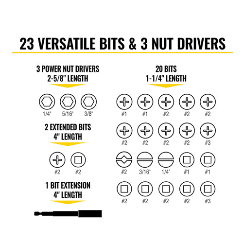 - Extended 4-Inch Phillips and Square bits for hard-to-reach fasteners
