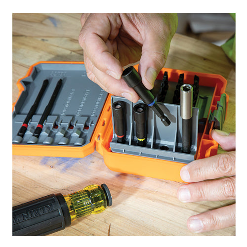 Klein Tools has designed a set of Impact Power Bits for the professional electrician. All the bits are made of high-impact rated S2 steel and color coded for easy identification. The 1-1/4-Inch (6.4 mm) long driver bits are easier to grip than a standard 1-Inch (25.4 mm) bit. The bit holder and nut drivers have strong magnets, and are also designed longer so they reach easily into junction boxes. Minimal chamfering on the nut drivers' hex pockets increases surface contact between the nut and driver for better performance. All 26 pieces fit snugly in a durable, impact-resistant case featuring steel hinges, a stay-shut latch, and a hidden compartment for loose bits.
