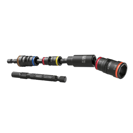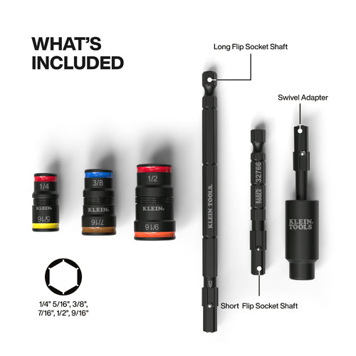 Klein Tools 6-Piece Swivel Flip Impact Socket Set delivers 7-in-1 versatility with a swivel head and 360-Degree rotation for tight -space access and smooth control. It includes both short and long shafts with magnetic retention for fast, one-handed driving across six common hex sizes. Built impact-rated, this set is made to handle high-torque tools on the jobsite.