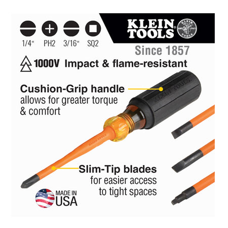 The Klein Tools' Slim-Tip Insulated Screwdrivers in this screwdriver set have slim profile tips that allow for greater access into terminal blocks, slim-style breakers, or other tight spaces near energized sources. A bright orange coating of insulation protects from electrical shock, is flame and impact resistant, and sits flush with the tip helping to reduce insulation chipping and cracking. Klein insulated tools exceed the ASTM F1505 standards for insulated tools, and are clearly marked with the official 1000-Volt rating symbol. A must-have for any electrician's tool bag, the 4-piece set includes 4-Inch round shank in a 1/4-Inch Cabinet tip and a #2 Phillips, as well as 6-Inch round shank in a 3/16-Inch Cabinet tip and a #2 Square tip.