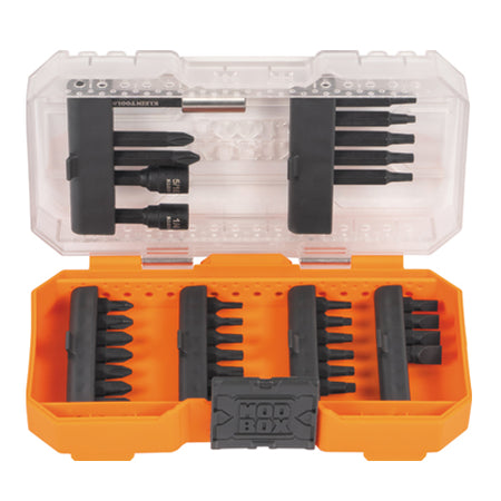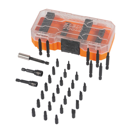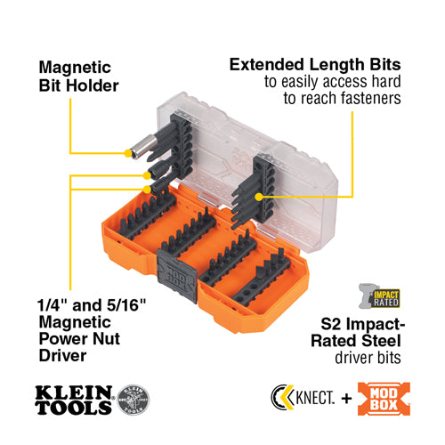 Klein Tools designed a set of impact driver bits for the professional tradesman and do-it-yourself enthusiasts. All of the bits are made of high-impact rated S2 steel. The 3-Inch bit holder and 1/4-Inch and 5/16-Inch nut drivers have strong magnets to easily hold bits and fasteners in place. Minimal chamfering on the nut driver hex pockets increases surface contact between the nut and driver for better performance. All 35 pieces fit in a durable, impact-resistant case featuring steel hinges, a stay-shut latch and modular stackability with other cases of similar design.
