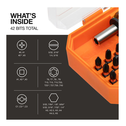 - Impact-Rated steel bit set with 42 total bits and adjustable screwdriver