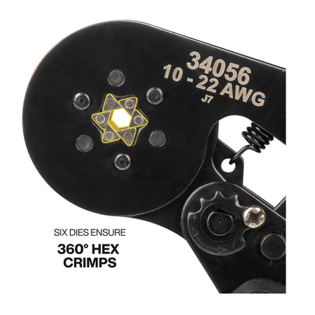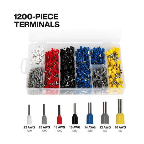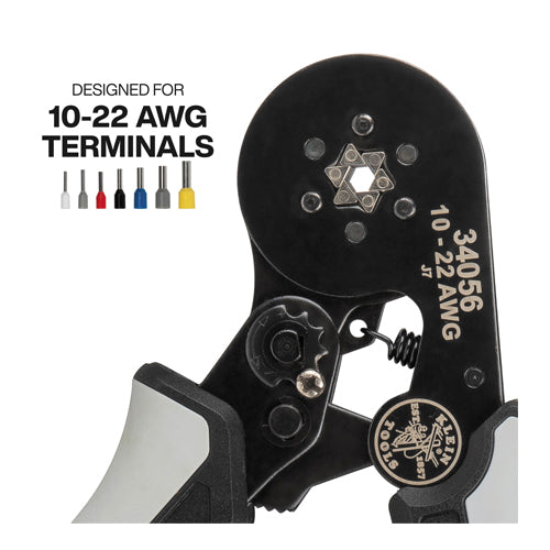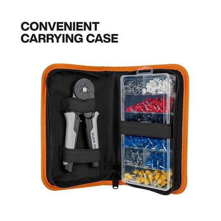 The Klein Tools Ratcheting Ferrule Hex Crimper Set delivers precision and versatility with the Ratcheting Hex Ferrule Crimper (Cat. No. 34056), 1200 terminals for 10-22 AWG wires, and a soft case for organized storage. Its ratchet ensures consistent hex crimps, while six precision dies create durable 360-degree connections. Ergonomic grips and an adjustable dial provide fine-tuned accuracy, combining comfort, efficiency, and reliability in one comprehensive set.