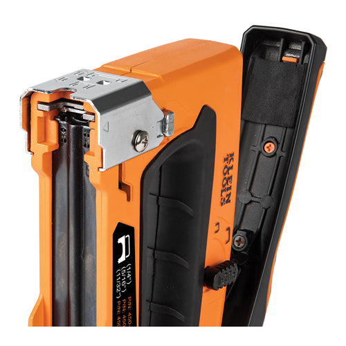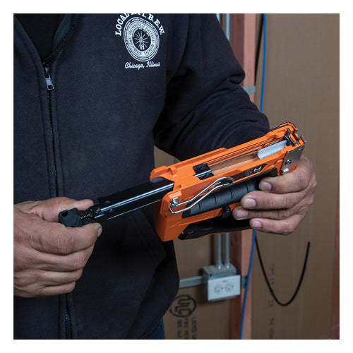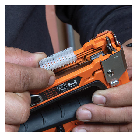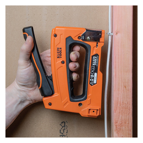 With Klein Tools' Cable Stapler, drive insulated staples for Voice, Data, Video, NM (Romex®) nonmetallic sheathed cable with one hand. It is designed to push the handle, rather than squeeze, for easy, consistent performance. This cast aluminum stapler adjusts for multiple sizes of staples including 1/4-, 5/16- and 11/32-Inch. Forward action design provides stability and drives the force to where the stapling is taking place. Use the lever setting to adjust the stapler force. Works solely with Klein staples (sold separately).
