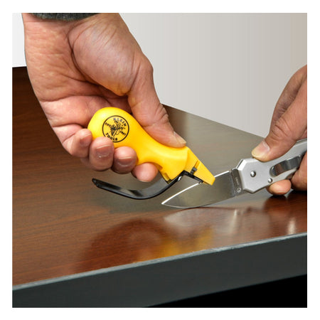 Keep your blades sharp with the Klein Tools Knife and Scissors Sharpener. The sharpener features tungsten inserts that conveniently sharpen both sides of the blade at the same time. The built-in guard protects your hand and fingers while you cut. The sharpener has a compact and lightweight design making it easy to store or transport.