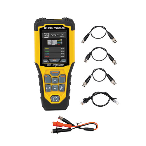 The Klein Tools Cable Length Meter is a portable Time Domain Reflectometry (TDR) cable length tester. It measures cable length, calibrates Velocity of Propagation (VoP) values, finds distance to faults in cables, and provides built-in tone generation for cable tracing. This tester provides accurate cable length measurement for a wide variety of cable types at an affordable price. Includes test leads and a carrying case.