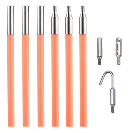 Klein Glow Fish Rods are the perfect solution for running wires through drop ceilings, attics, floors, walls and crawl spaces. This low-flex rod is designed for maximum rigidity to push straight, long distances without bending. The Splinter Guard™ coating glows bright orange to quickly identify the right flex for the job and improves visibility in low-light. This 30-Foot rod includes a hook, bullet and an adapter that creates a smooth connection to add-on mid or hi-flex rods.