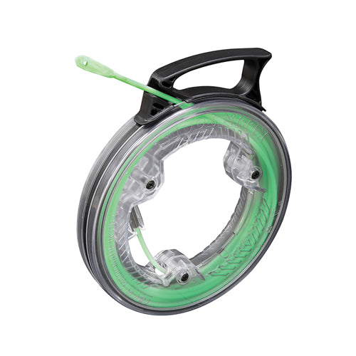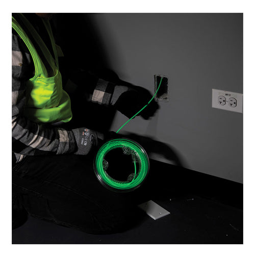 Klein Tools' first fully glow-in-the-dark fish tape. The unique clear case permits ambient light to easily charge the glow tape and tip, providing a bright glow for use in low light. The fiberglass tape is fully removable from case for one-way wall cavity, drop ceiling, and conduit pass through feeding. The anchor end features a stainless-steel fish rod connector so any of our fish rod accessories can be attached to the end of the fish tape, allowing this fish tape to also function as a super-flex glow rod. An optimal fish tape for installing wire or cable behind walls and ceilings, in short box-to-box runs and branch circuits, or in flexible tubing. This fish tape's compact size makes it a great addition to your everyday tool bag.