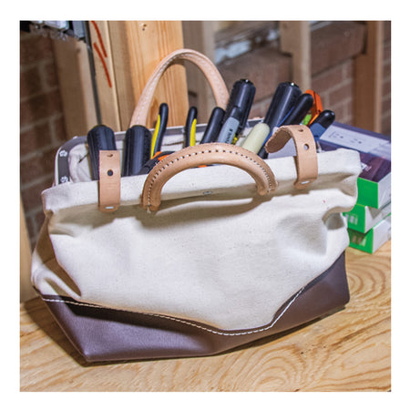 The Klein Tools 14-Inch Tool Bag is built of heavy-duty no. 8 natural canvas, and features 2 retaining straps with buckles for a secure closure. The bag's vinyl bottom and lower sides offer extra support and moisture resistance, while the non-scratch studs on the base protect against wear. The bag's seams are reinforced with rivets for added durability. Retro-fit bags with shoulder strap kit (Cat. No. 5102S). Kit includes leather strap with pad and snap hooks, rings and fasteners for attaching rings to bags.