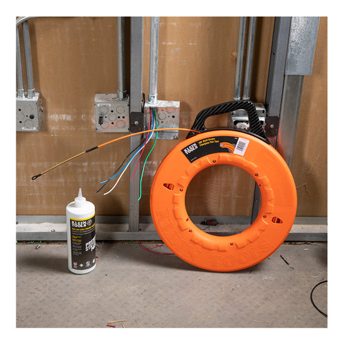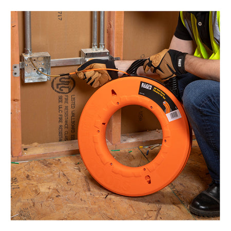 Klein Tools' Multi-Groove Fiberglass Fish Tapes feature a low-friction, easy feed design. The grooved profile and fiberglass core provide rigidity for long distances and less surface contact with wires when pushing through crowded conduit. The non-conductive fish tape and non-conductive eyelet tip offer added protection against shock from energized sources.