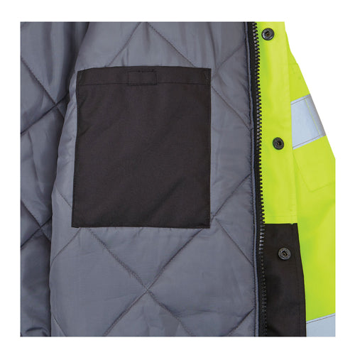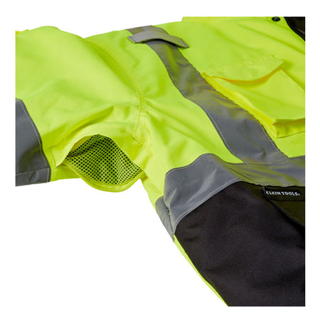 The High-Visibility Winter Bomber Jacket from Klein Tools is water and wind resistant with insulation for superior warmth. It features 10 pockets, attached inset hood, and zippered underarm vents. ANSI rated Type R, Class 3.