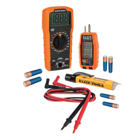 Klein Tools Premium Electrical Test Kit includes a Manual-Ranging Digital Multimeter (Cat. No. MM320) with right-angle test leads, Dual Range Non-Contact Voltage Tester with Flashlight, 12 to1000 VAC (Cat. No. NCVT3P), and a GFCI Receptacle Tester with LCD (Cat. No. RT250). This convenient kit features products for a variety of applications with safety and reliability in mind. Comes with all required batteries.