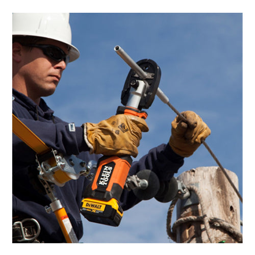 Klein's battery-operated cable crimper is engineered to make linemen's work more efficient by reducing the time and effort needed on the job. Crimps up to 600 MCM copper, 350 MCM aluminum and 477 ACSR cable. 7-ton hydraulic force crimps a larger capacity faster than similar models on the market. Compatible with industry standard W-style dies. Powered by DeWALT 20V lithium-ion batteries. Includes cutting jaw, two 2 Ah batteries, charger and bag.