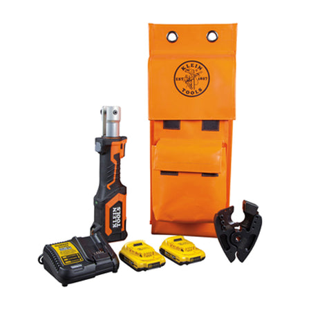 Klein's battery-operated cable cutter is engineered to make linemen's work more efficient by reducing the time and effort needed on the job. Cuts up to 500 MCM copper, 500 MCM aluminum and 556 ACSR cable. 7-ton hydraulic force crimps a larger capacity faster than similar models on the market. Compatible with industry standard W-style dies. Powered by DeWALT 20V lithium-ion batteries. Includes cutting jaw, two 2 Ah batteries, charger and bag.