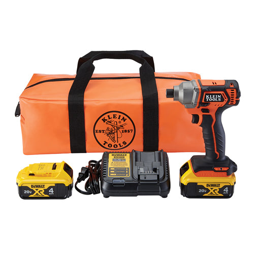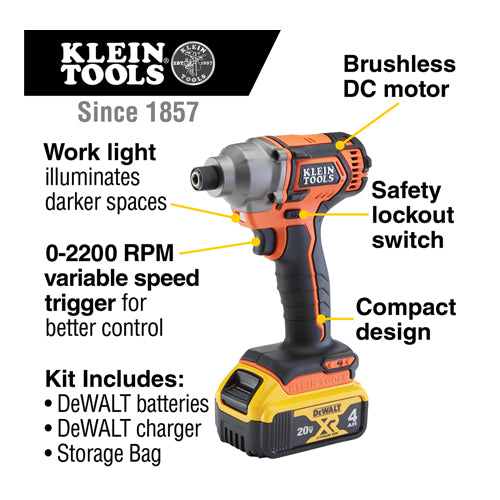 Klein's Compact Impact Driver for professional impact fastening and drilling applications offers 210 ft-lbs of max torque to get the job done fast. Engineered and designed by Klein Tools in the USA, the impact function makes this tool particularly useful for driving fasteners in wood, metal and concrete. The variable speed trigger provides better control. Users can change driving bits quickly with the 1/4-Inch quick connect chuck. Powered by 20V lithium-ion DeWALT batteries.