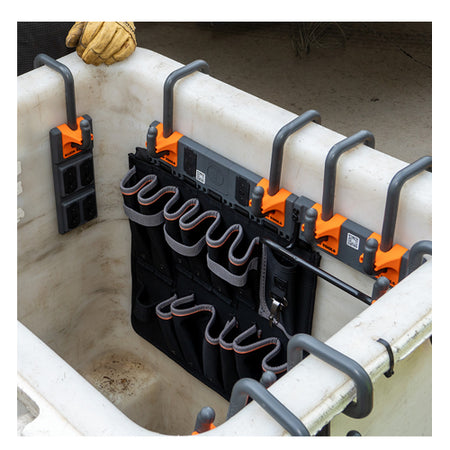 The Bucket Work Center is an ecosystem that will revamp the way a Lineman works. It allows Lineman to customize their workspace, just like other professionals customize their office space. Klein Tools' Magnetic Tool Storage Module has four Rare Earth magnetic plates to hold hand tools, sockets, bits and other small parts. This will be the Lineman's office. The S-Hook System easily attaches to aerial buckets with a standard 2-Inch or 3-Inch (5.1 or 7.6 cm) bucket lip. An assortment of modules are available to customize each workstation to fit the tools needed for the job.